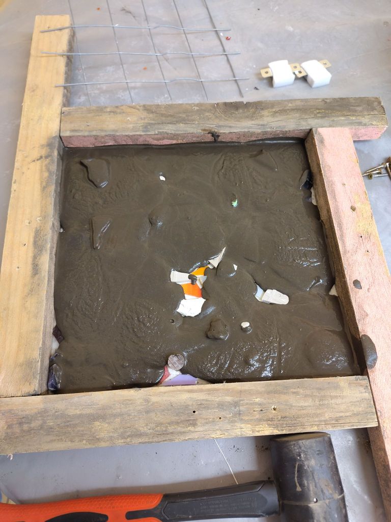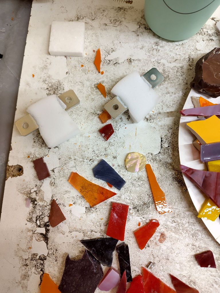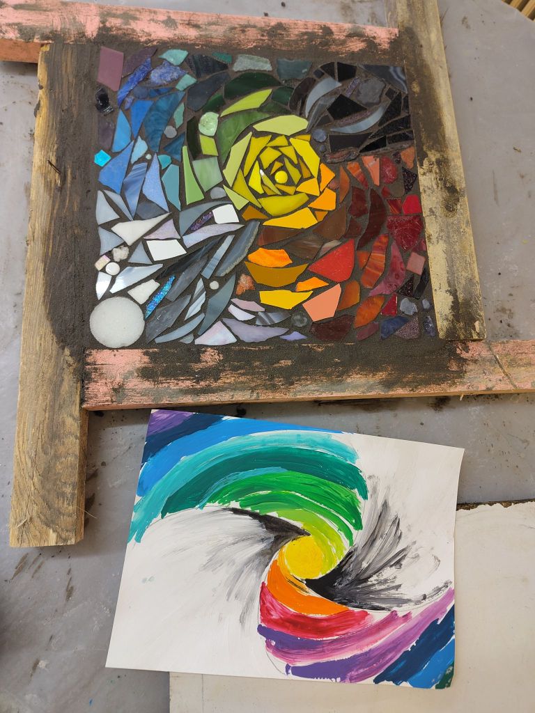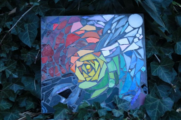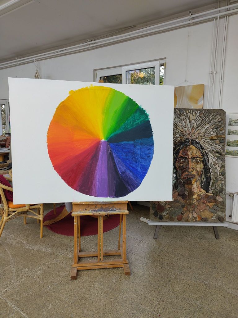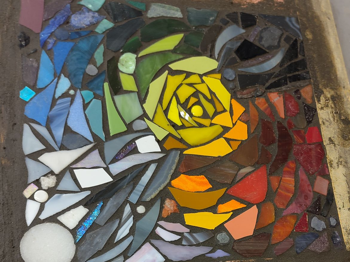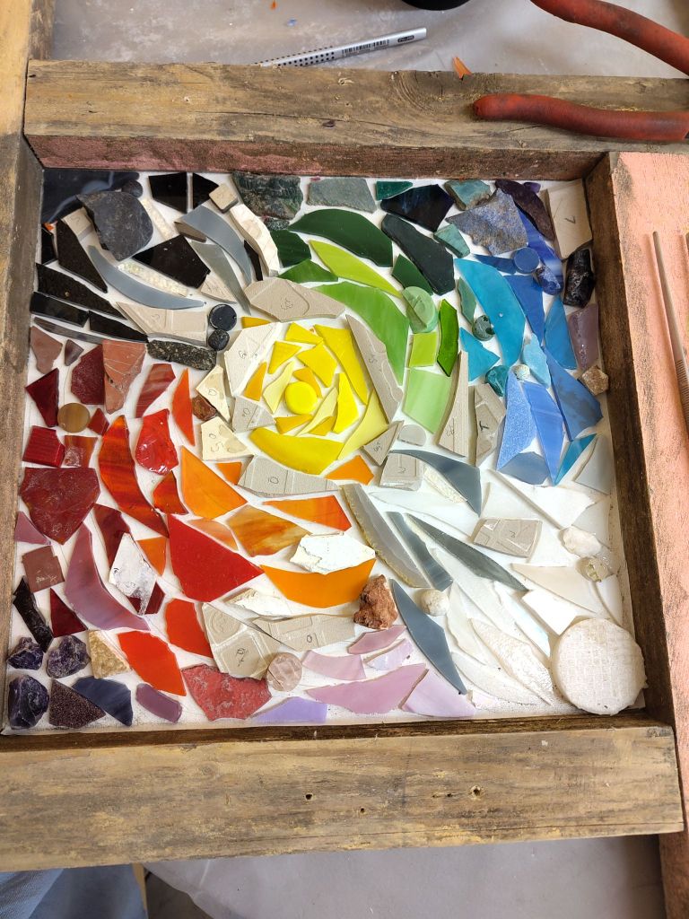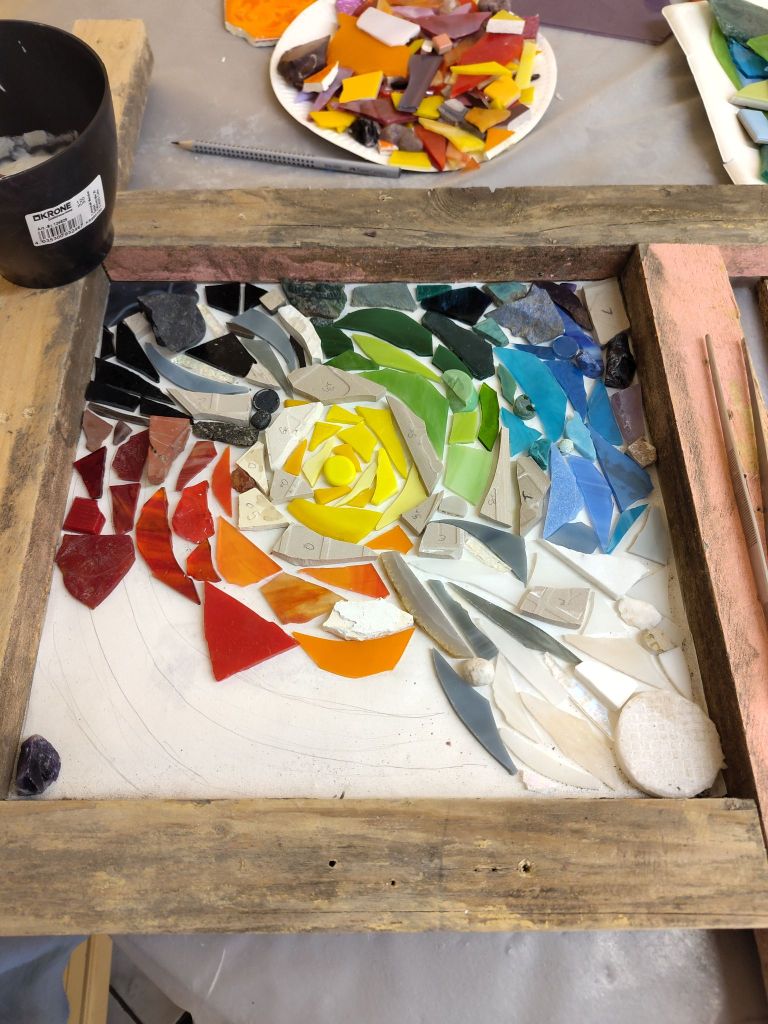 Im Modul 2 – Farben und Formen im Mosaik haben wir uns am Anfang mit dem Farbkreis beschäftigt. Ich hatte hier die Farbe Gelb, die dann auch später im Mittelpunkt meiner Mosaikarbeit stand. Weiteres zum Modul und die Werke meiner Mitstudentinnen gibt es hier. Dieses mal wurde mit der Umkehrverfahren gearbeitet, hier werden die Steine mithilfe eines Mehlklebers auf Papier geklebt und anschließend mit Beton übergossen.