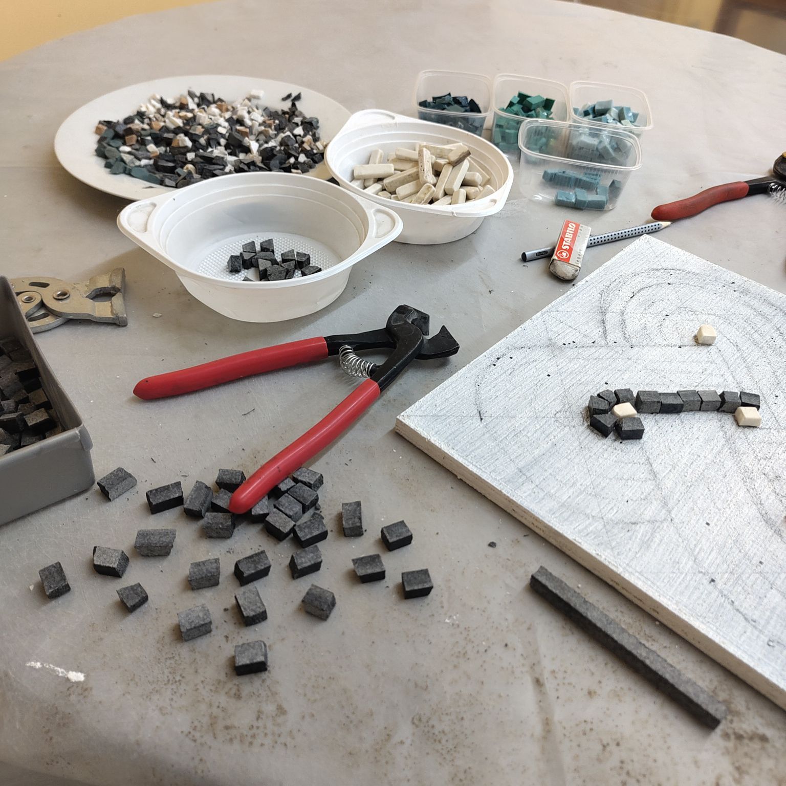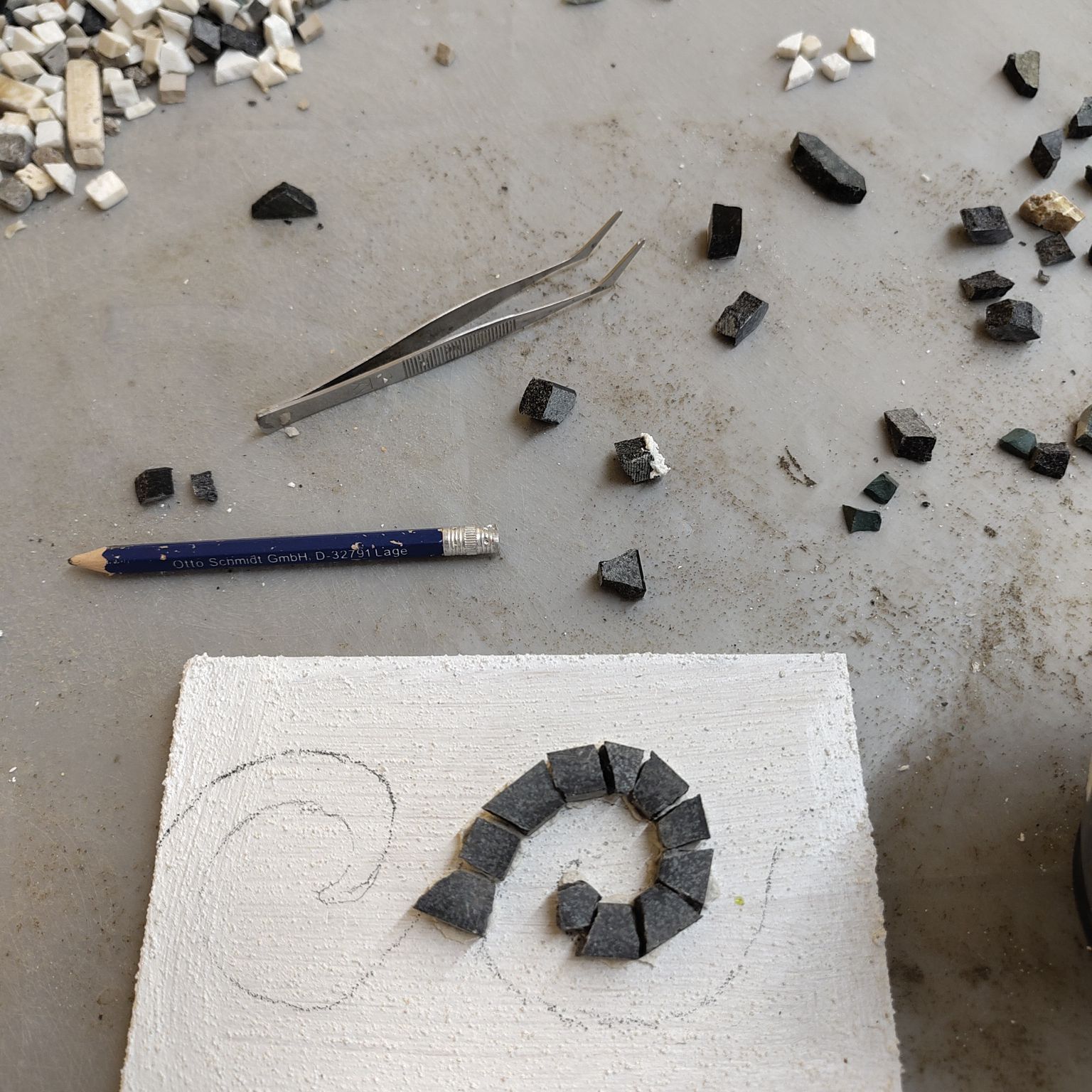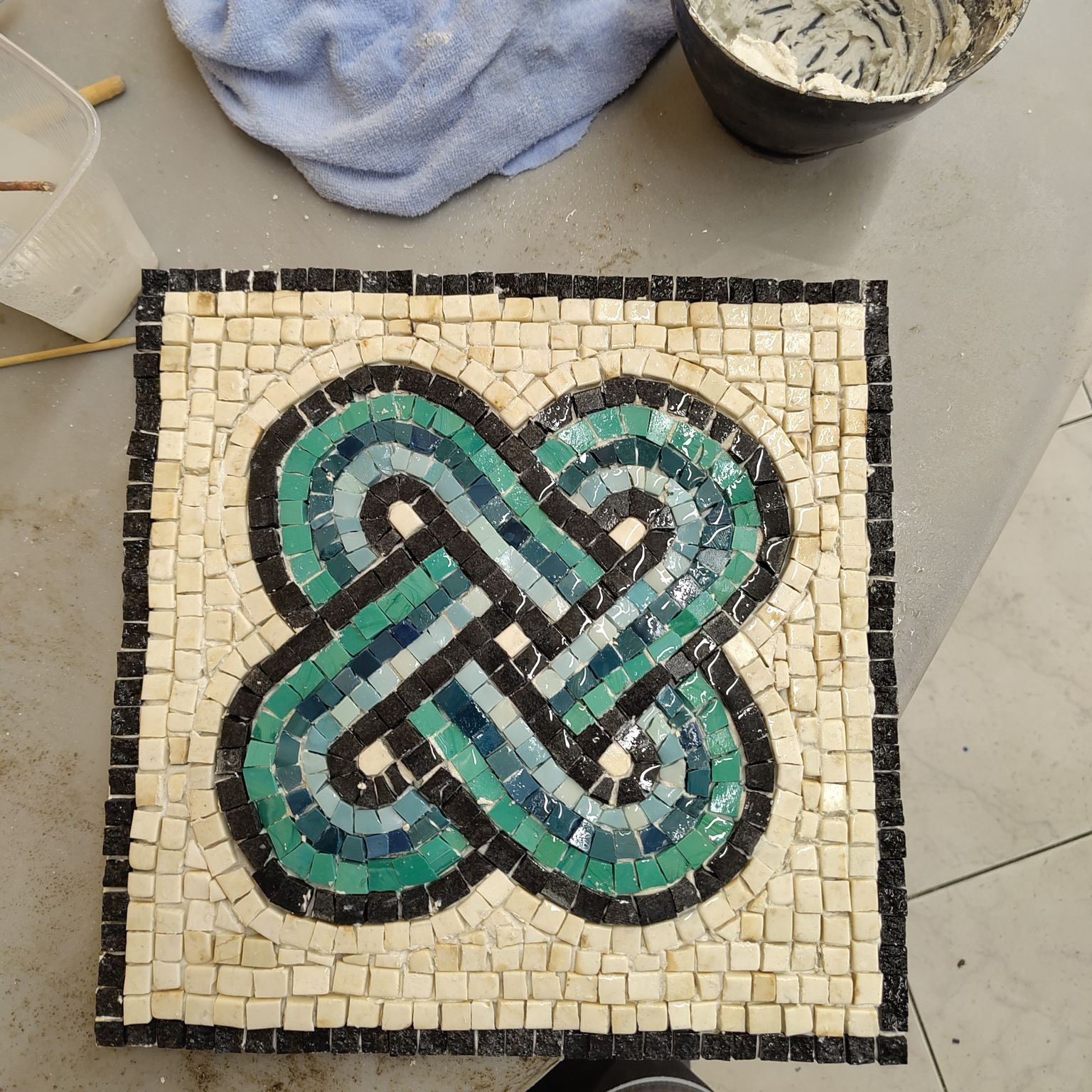 Gemeinsam mit dem Dozenten Houran Almahrouk haben wir das klassische Mosaik entdeckt. Mit Hammer und Dorn werden Smalten oder Natursteine in Form gebracht und dann ein selbstgewähltes Motiv erarbeitet. Ich habe mich bewusst fur den salomonischen Knoten entschieden, dieses selbst entworfen und in eigener Farbwahl gelegt.