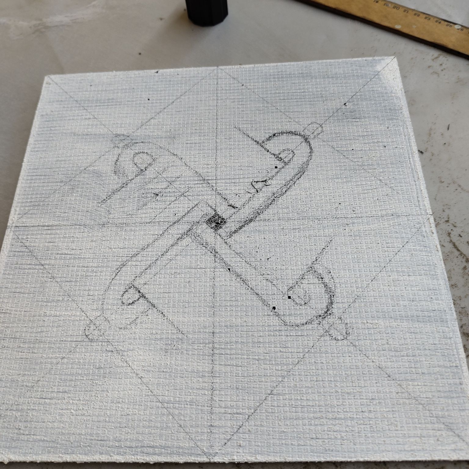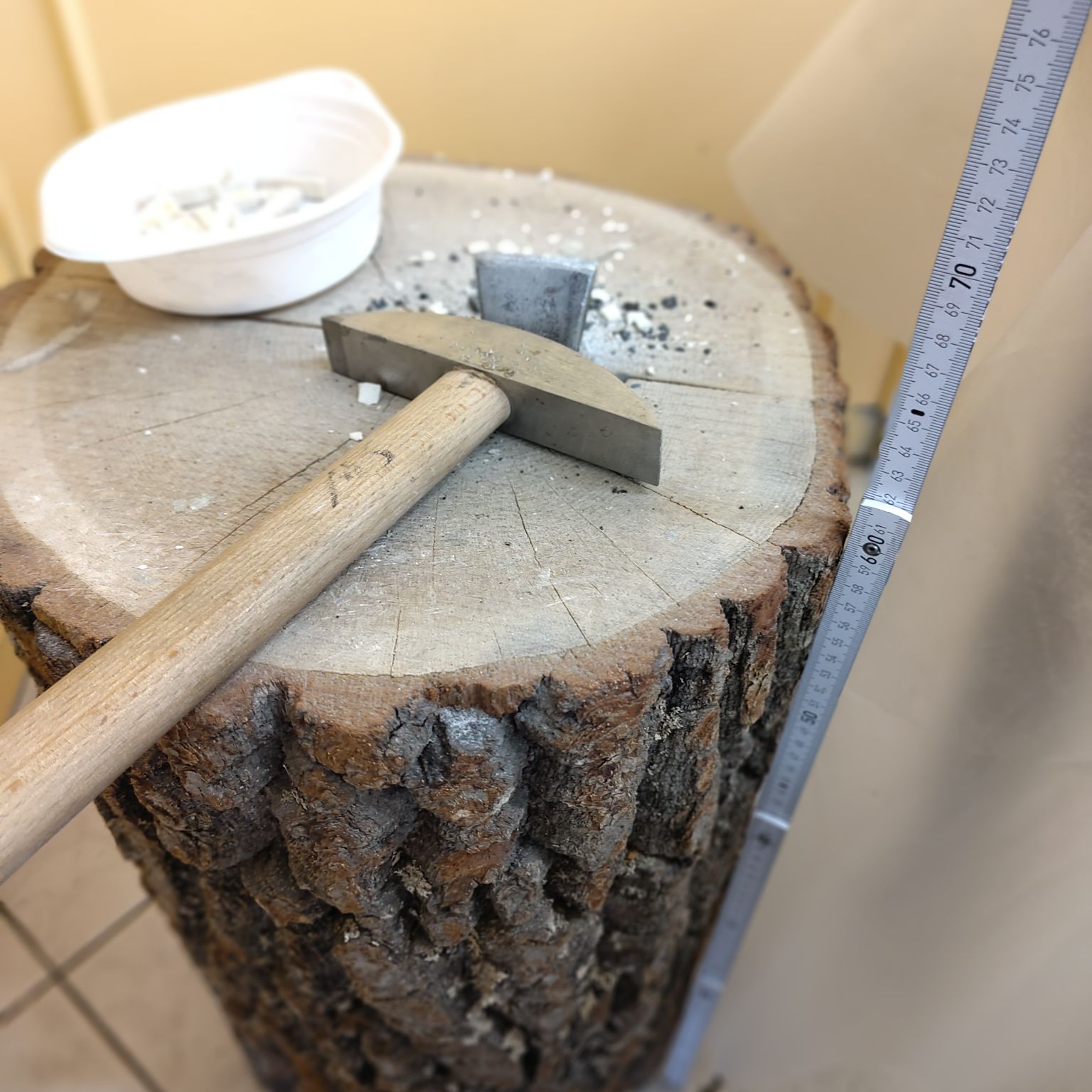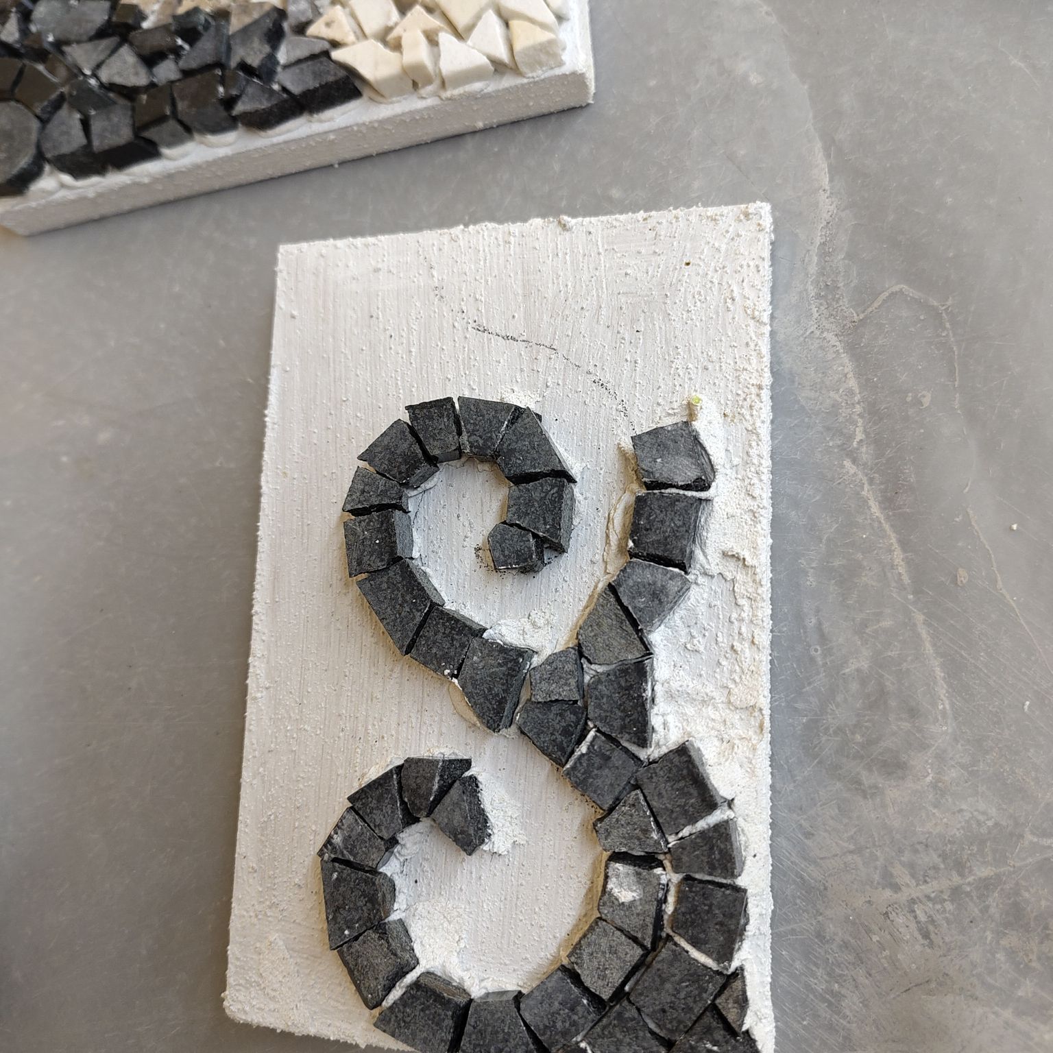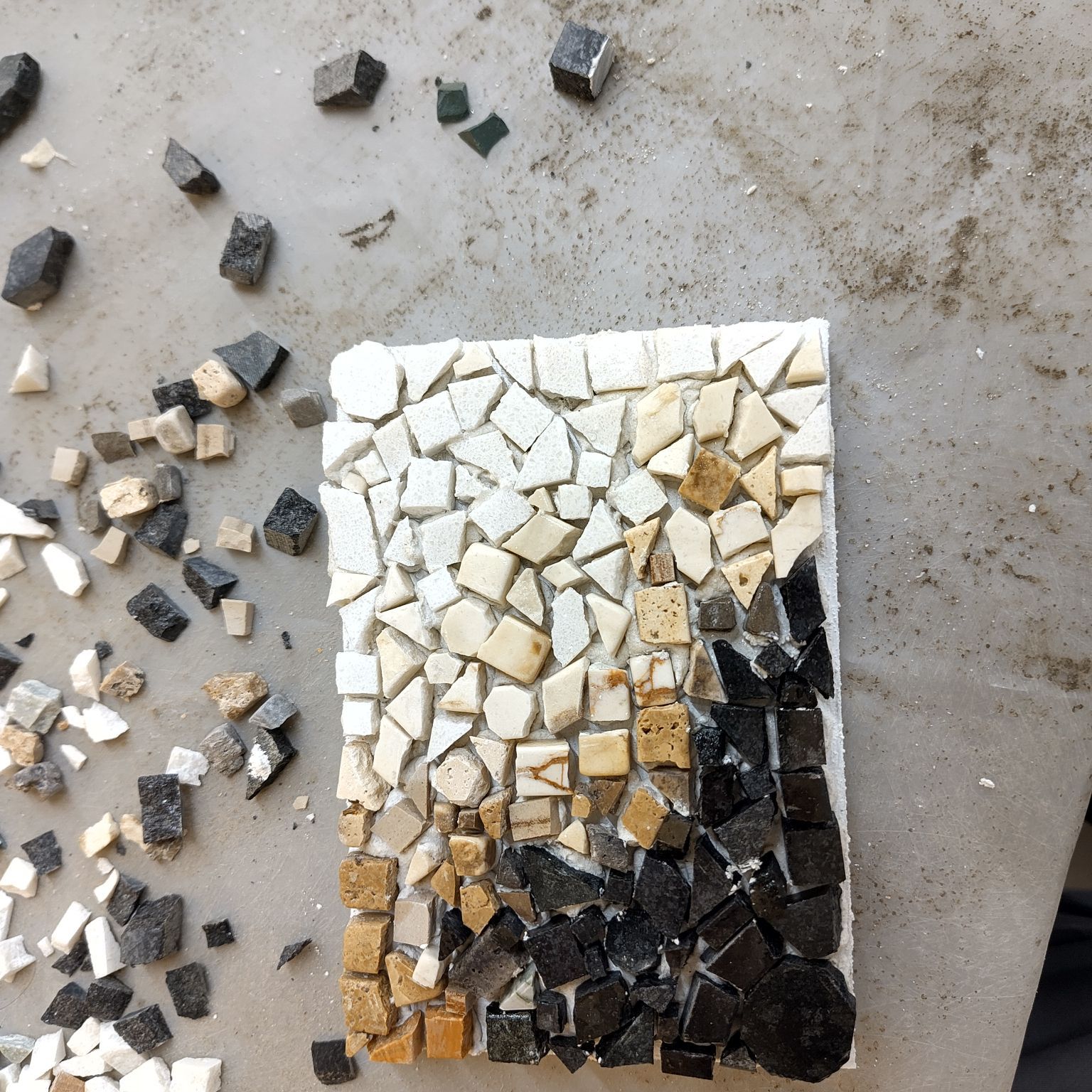 Gemeinsam mit dem Dozenten Houran Almahrouk haben wir das klassische Mosaik entdeckt. Mit Hammer und Dorn werden Smalten oder Natursteine in Form gebracht und dann ein selbstgewähltes Motiv erarbeitet. Ich habe mich bewusst fur den salomonischen Knoten entschieden, dieses selbst entworfen und in eigener Farbwahl gelegt.