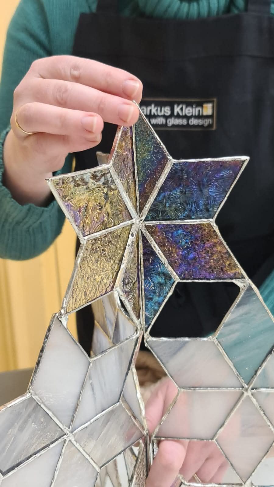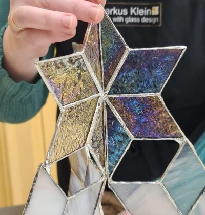 Ich habe mir etwas besonderes im Vorfeld überlegt, ich wollte das Fenster aus der Netflix-Serie Wednesday machen. Nach 6 Teilen, und 4 Pflastern an den Händen habe ich doch was anderes probiert und eine Anleitung von Markus Klein für einen Baum aus Sternen genommen. Hier habe ich eine Möglichkeit ausprobiert, mit der man schnell viele ähnliche Teile schneiden kann. Auch in diesem Modul habe ich viel neues gelernt.