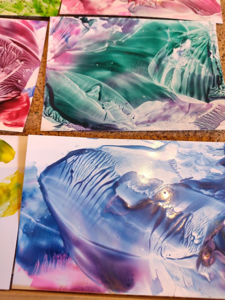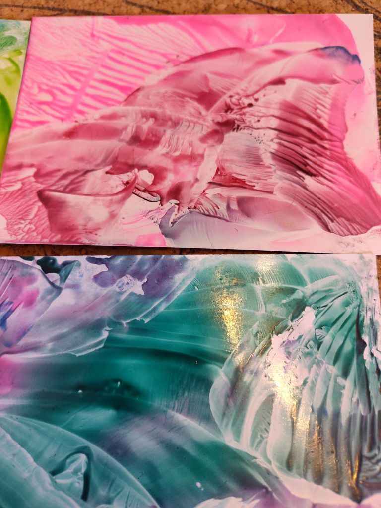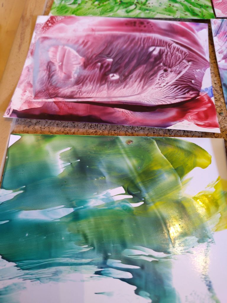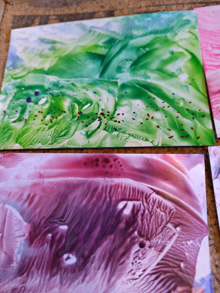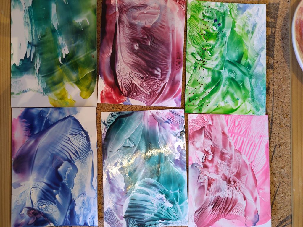Enkaustik ist eine Technik, die ich schon sehr früh kennengelernt habe. Bereits in der Grundschule war das etwas, was man bei Kindergeburtstagen oder Zuhause machen konnte und bei der erstaunliche Ergebnisse rauskamen. Hier wird besonderes Enkaustik Wachs mithilfe eines Bügeleisens auf glattem Papier aufgetragen, Durch die Bewegungen entstehen abstrakte Bilder oder Landschaften. Jetzt habe ich es mit meiner Tochter ausprobiert und es sind wieder tolle Werke entstanden.