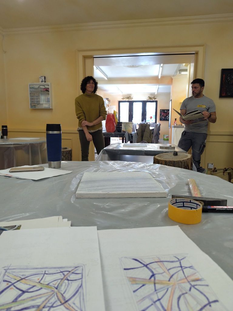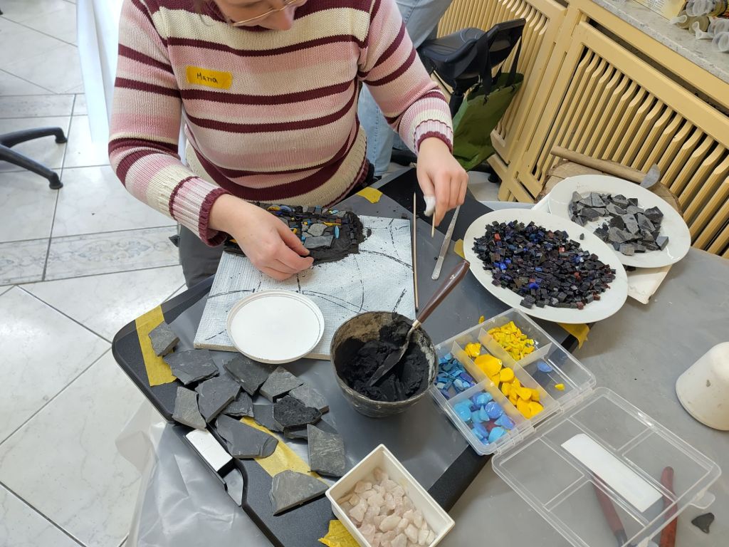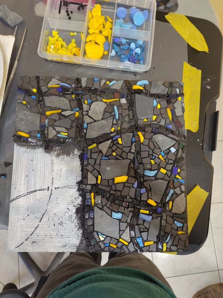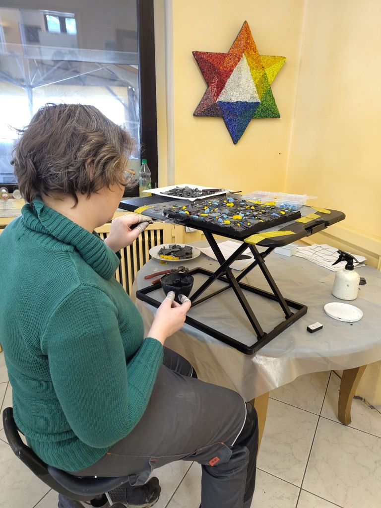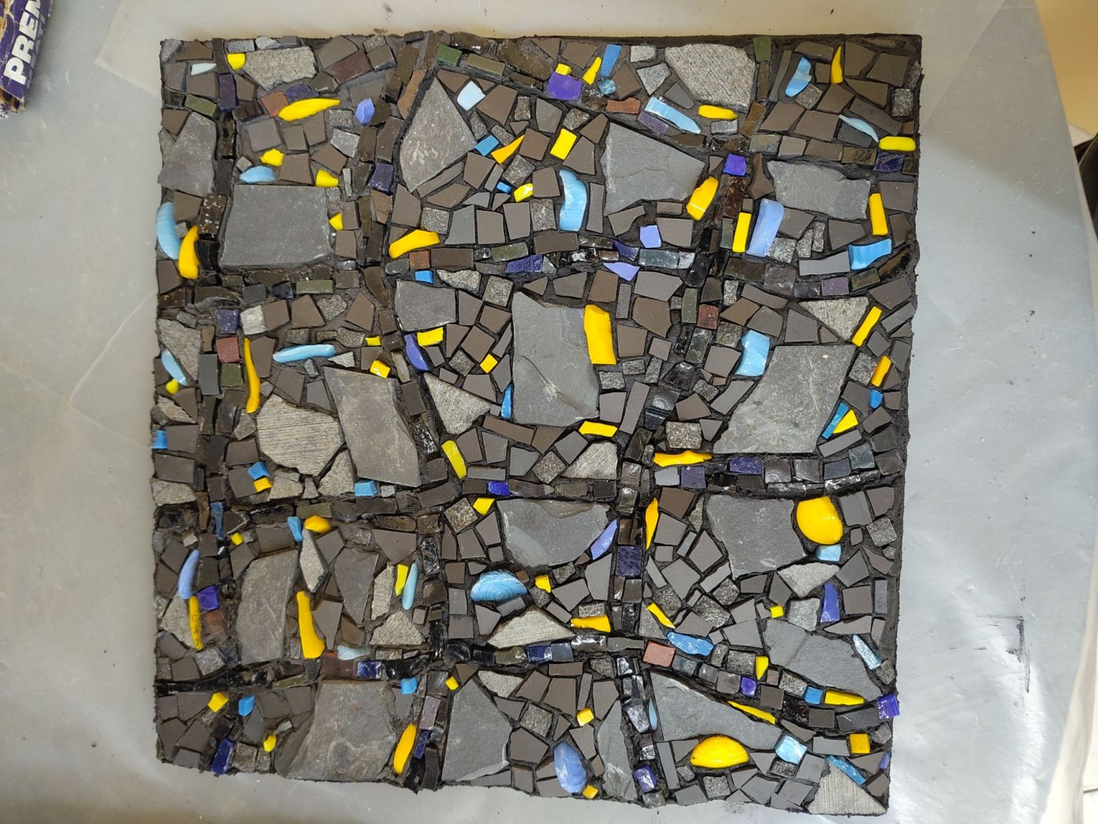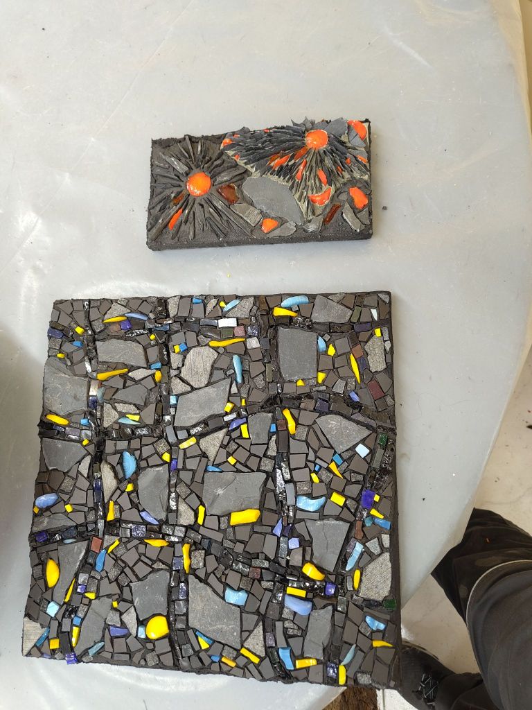 Im Vorfeld dieses Moduls sollten wir Entwürfe anfertigen. Mit verschiedenen Materialien entstand ein modernes Mosaik in direkter Setztechnik. Mehr zu dem Modul gibt es hier.